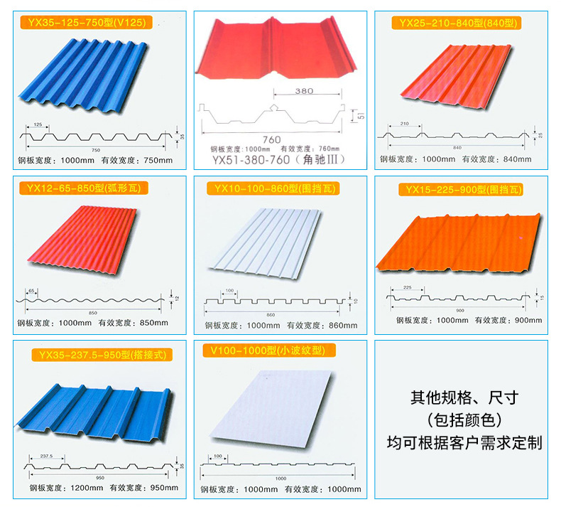 YX25-210-840產(chǎn)品的基板為冷軋基板,熱鍍鋅基板和電鍍鋅基板。涂層種類可分為聚酯、硅改性聚酯、偏聚二氟乙烯和塑料溶膠。彩鋼板的表面狀態(tài)可分為涂層板、壓花板和印花板,彩鋼板廣泛用于大型公共建筑、公共廠房、活動(dòng)板房、及集成房屋的墻面和屋面、交通運(yùn)輸?shù)刃袠I(yè),對(duì)于建筑業(yè)主要用于鋼結(jié)構(gòu)廠房、機(jī)場(chǎng)、庫房和冷凍等工業(yè)及商業(yè)建筑的屋頂墻面和門等。