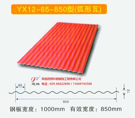YX12-65-850型鋼板是在連續(xù)機(jī)組上以厚度一般在1.5mm以下的冷軋卷板、鍍鋅/鍍鋁鋅卷板為基板,經(jīng)過表面預(yù)處理(脫脂和化學(xué)處理),用輥涂的方法,涂上一層或多層液態(tài)涂料,后經(jīng)過烘烤和冷卻的板材。