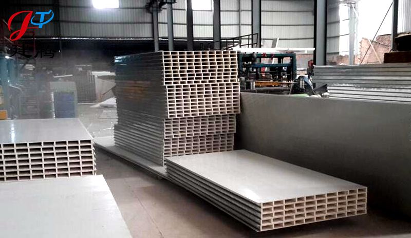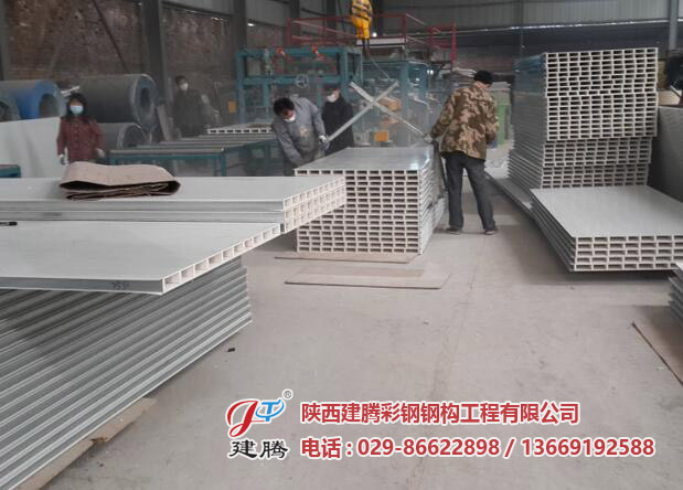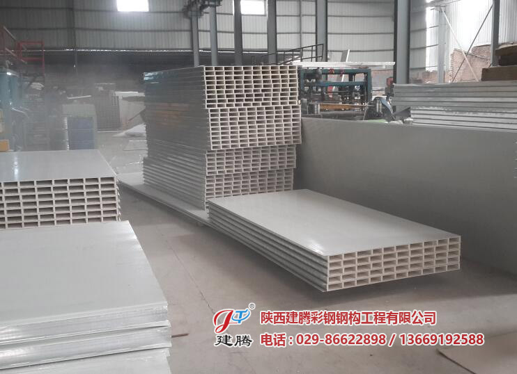 中空玻鎂彩鋼夾芯板以二層5mm防火玻鎂板、中間加防火玻鎂內(nèi)隔條為芯材 ,經(jīng)彩鋼夾芯板多功能連續(xù)生產(chǎn)線復(fù)合成型,中空玻鎂彩鋼夾芯板其特點(diǎn)板材 為防火不燃材料組成,有效提高了彩鋼夾芯板的防火性能,又能滿足在有防潮 濕環(huán)境條件下使用;其芯材為中空板材,用于車間隔墻在電氣施工鋪設(shè)暗線時(shí) 較為方便,該產(chǎn)品投入生產(chǎn)后被廣泛使用于凈化車間無(wú)塵室的吊頂及隔墻。